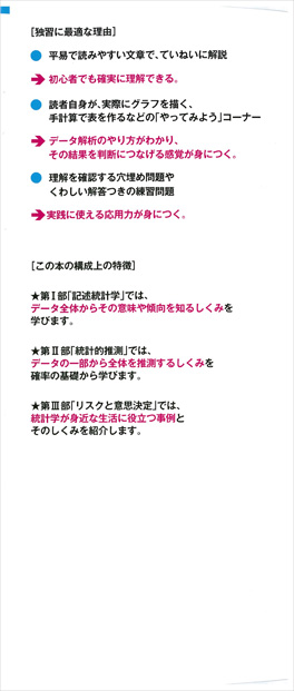 「統計学のこころ」は,数学で書かれています。この本では,数学準備編として「数学のこころ」を説明する章を用意し,さらに記述統計学と統計的推測の説明に進んでいます。