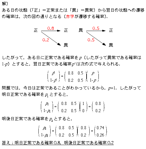 ある生産工程において,正常な工程が翌日以上をおこす確率は0.2,ある以上な工程が翌日修理されて正常になっている確率は0.5である.今日ある工程が正常だとして,明日・明後日に異常である確率を求めよ.