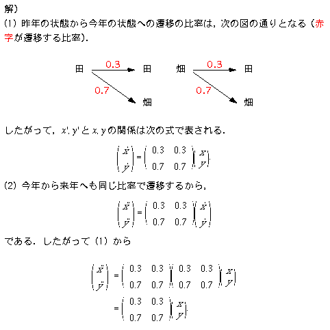 (1)今年は,昨年の田の70%を畑に,畑の30%に振り向ける.今年の田,畑の作付け面積をそれぞれx' アール,畑がy' アールとするとき,x' , y' をx, yで表せ.