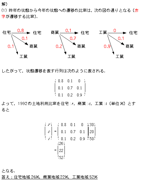 ある都市の1992年の土地利用比率は,住宅地域30%,商業地域20%,工業地域50%であった.また,この5年間に,住宅地域の10%が商業地域に,10%が工業地域に変化し,また商業地域の10%が住宅地域に,20%が工業地域に,さらに工業地域の10%が商業地域に変化した.1997年の土地利用比率を求めよ.