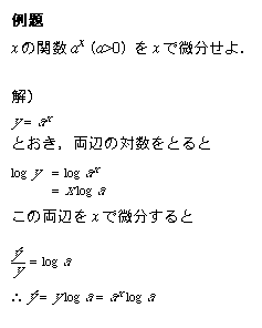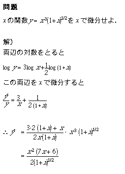 このように,ある関数の対数の微分が簡単に計算できるとき,対数微分法は有効です.なぜならば,「対数をとる」という操作は,「指数をかけ算に,かけ算をたし算に」変えてくれるからです.