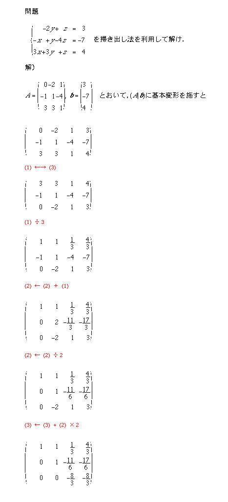 このような,行列の基本変形を用いた連立一次方程式の解法を「掃き出し法」と呼びます.