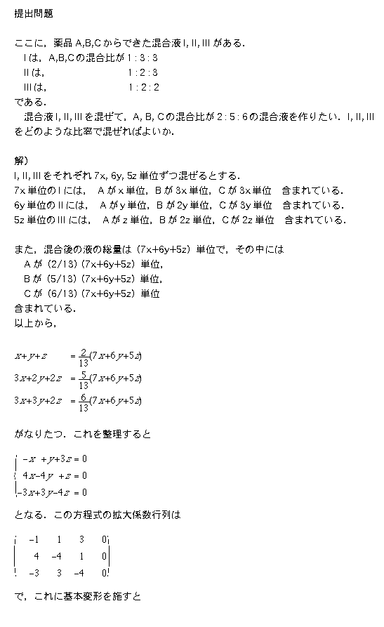 先々週の演習で行ったように,行列の基本変形は連立方程式を解く作業に対応する操作です.先々週と同じ次の方程式をもう一度考えます.