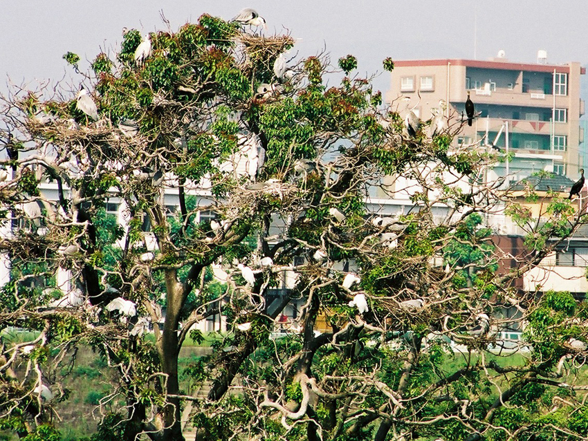 広島市は,太田川の三角州の上に広がる町です.広島市内で,川はいくつにも分岐して行きます.それらの分岐点の中で,上流からみて,後に開削された放水路への分岐を別にすると最初の分岐点に,小さな中州があります. この中州は,400年ほど前に毛利氏が三角州を開拓し,広島城と城下町を築いた「島普請」の時からある,という説があります.その真偽はわかりませんが,小さな中州にもかかわらず大きな木が何本も生えているようすには,確かに古くからあったと思わせるものがあります. そして,この木々には,サギやカワウがびっしりと巣を作っています.川の中にある中州には人や犬が渡ってこないので,「野鳥の楽園」になっているわけですが,まわりを高層マンションや幹線道路,新交通システムの高架に囲まれている中で,ここだけが,自然のままに保たれた不思議な風景を保っています. この「野鳥の楽園」は,広島ではよく知られており,ネット上でも写真がいくつも見つかります.私も,通勤途中でバスを降りて,写真を撮ってみました. ※写真をクリックすると別ウィンドウで拡大します.今回の写真は,フィルムカメラのPENTAX MX-3, 80-210mmで撮影し,ラボでCDに入れてもらったものです. 野鳥のようすを写してみました. 参考リンク