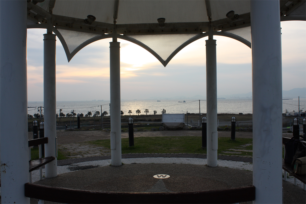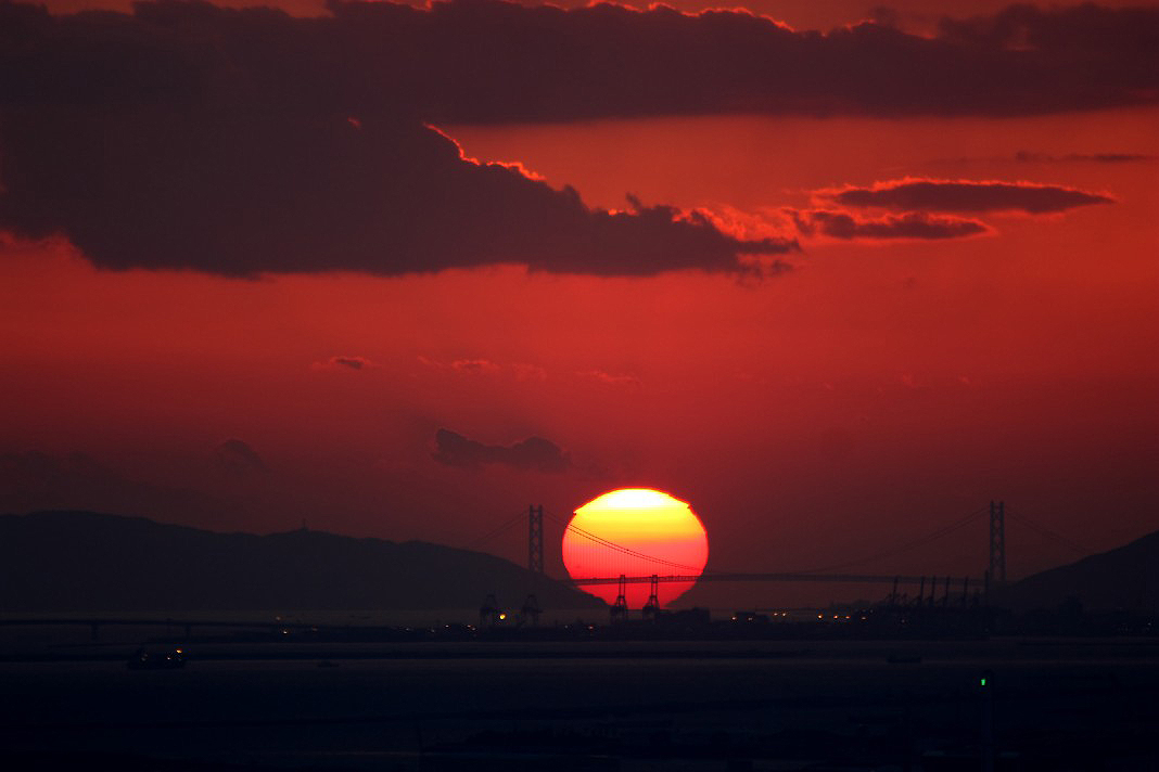 梅田スカイビルの空中庭園から撮影した,明石海峡大橋に沈む夕陽です.撮影したのは2010年2月19日です.年に2回,それぞれ約1週間に限り,この景色を見ることができます.([地図,広域地図])