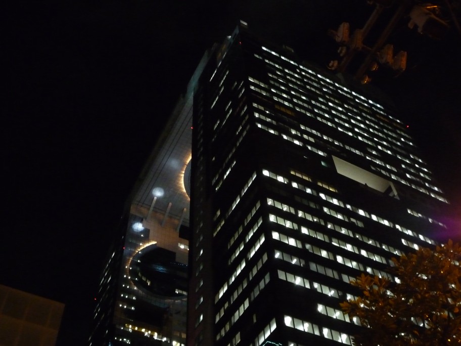 梅田スカイビルはこんな形のツインビルで,2つのビルを最上部でつないでいる部分が空中庭園になっています.ここは,高層ビルからの景色を窓越しではなく外に出て見られる,数少ない場所です.ただ,外に出ると風が強く,またこの日は雪も降ってきて大変でした.