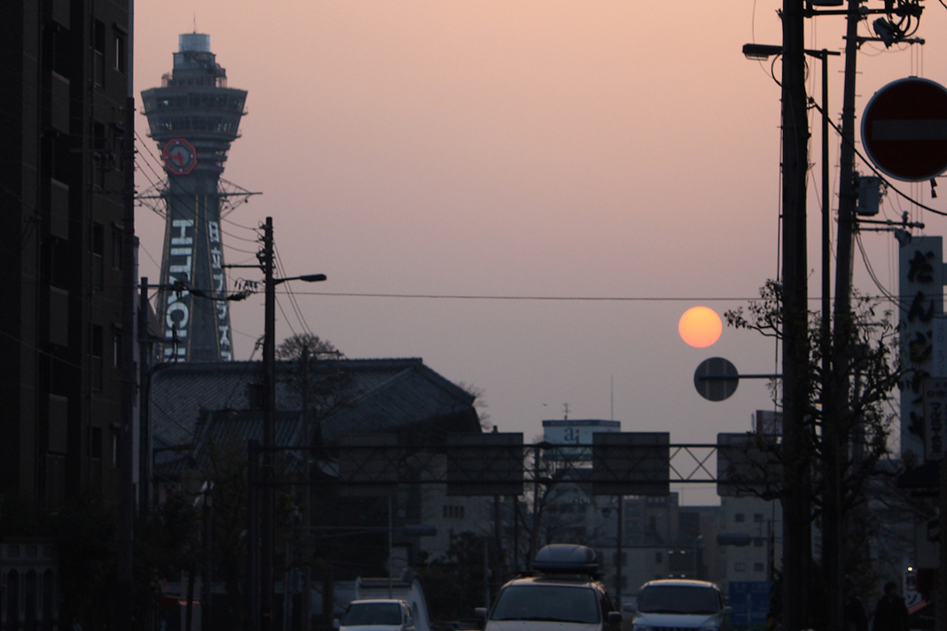 夕陽ヶ丘が夕陽の名所である理由に,西側が急な下り坂になっていて,視界が開けているということがあります.上の写真は,四天王寺前交差点から見た夕陽です.通天閣は,坂の下のかなり低いところに建っています.